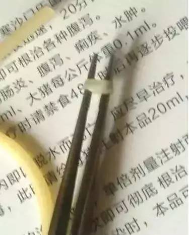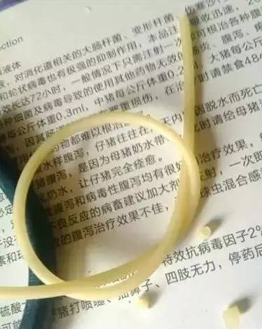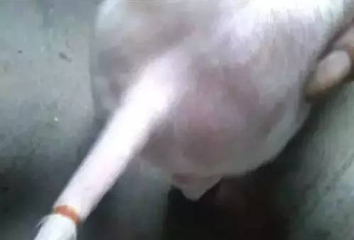 然后把气门芯用剪刀剪成0.2厘米长左右的小段,取一小段气门芯套在平时注射时都需要用的镊子开口端,此时稍微用力就可以把气门芯撑大,操作时只要借助镊子把撑大的气门芯套在新生仔猪尾巴上距离尾根2.5-3厘米处就算完成了,如下图所示: