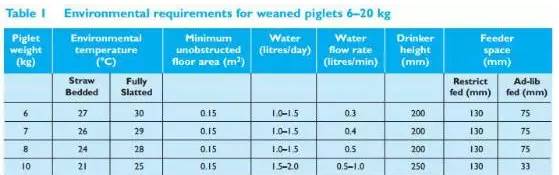 避免温度波动;至少每天检查1次最高温和最低温。推荐温度见表1;杜绝任何贼风,并控制气流以防仔猪受寒,但要保证空气质量;确保光照充足,以确保所有仔猪都能够找到饲料和饮水,最好是安装定时器来控制每天的关灯和开灯时间;